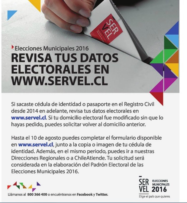 Por lo indicado en párrafo anterior, el Servicio Electoral (SERVEL) ha generado una instancia con la cual podrá solicitarse por aquellas personas afectadas por la modificación volver a su domicilio electoral anterior. En tal sentido se ha establecido un mecanismo mediante el cual poder solicitar esta modificación ingresando en nuestra página web www.servel.cl en el link http://www.servel.cl/si-sacaste-cedula-de-identidad-o-pasaporte-revisa-tus-datos-electorales/ o concurriendo directamente a nuestra oficina ubicada en calle Lynch N° 424 de la ciudad de Temuco, de lunes a viernes en horario de 09:00 a 14:00 horas hasta el día miércoles 10 de agosto, al momento de solicitar la modificación deberá presentarse la cédula de identidad.