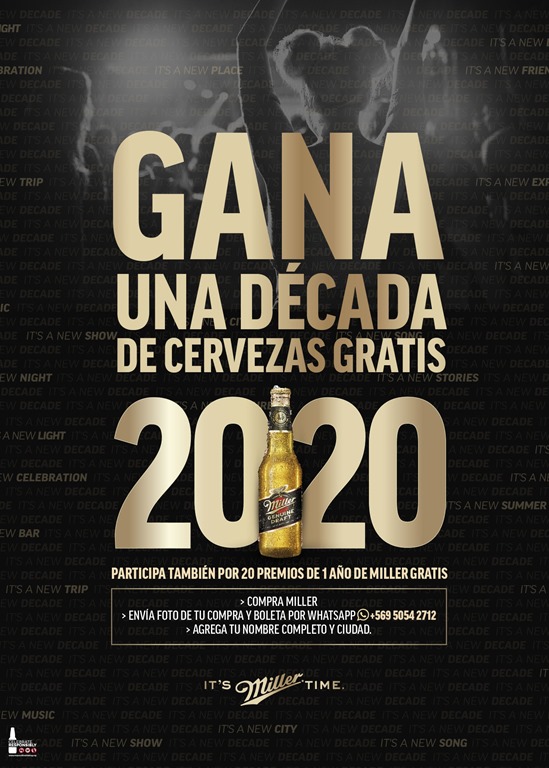 Miller regalará una década de cerveza gratis, más 20 premios de un año de cerveza gratis a todos aquellos consumidores que prefieran cerveza Miller.