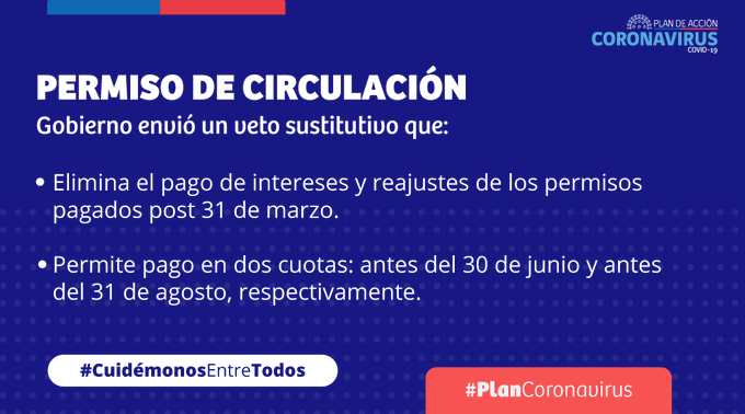 El 27 de marzo el Congreso aprobó un Proyecto de Ley que elimina las multas por conducir un vehículo sin permiso de circulación vigente. Sin embargo, este proyecto no eliminó el pago de intereses y reajustes al momento del pago del permiso de circulación, si este ocurre con posterioridad al 31 de marzo.