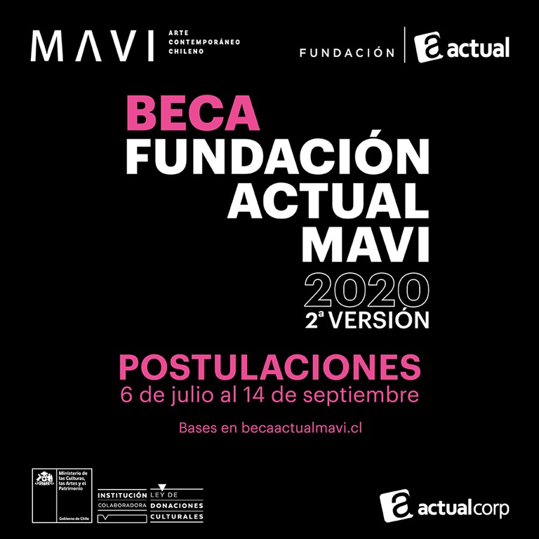 La postulación a la Beca Fundación Actual MAVI 2020 es gratuita y estará abierta desde el 6 de julio al 14 de septiembre de 2020 para artistas de 40 a 60 años que hayan expuesto individual o colectivamente en los últimos 5 años. En esta segunda versión de la Beca, la temática es libre y recibe sólo proyectos expositivos en formato bidimensional tales como pintura, ilustración, gráfica, fotografía, collages y textiles.