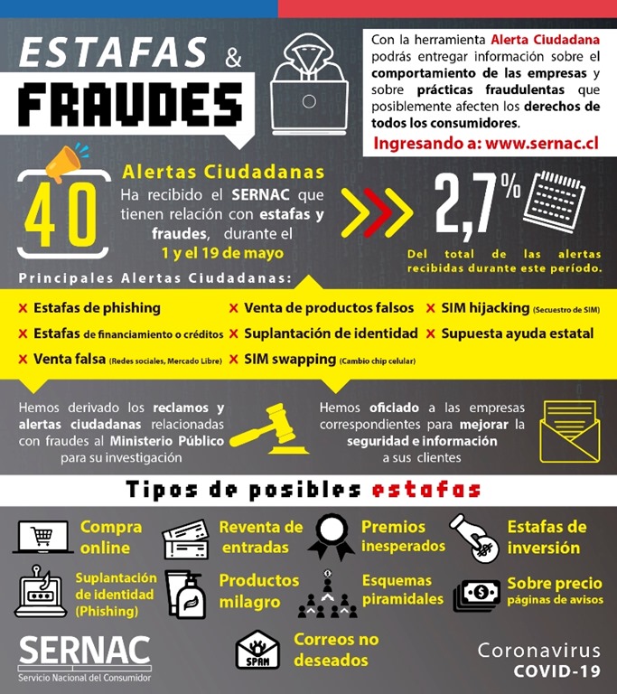 El SERNAC, durante el 1 y el 19 de mayo, recibió 40 alertas ciudadanas que tienen relación con estafas y fraudes, lo que equivale a un 2,7% del total de las recibidas durante este período.