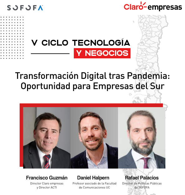 A fin de generar un espacio de conversación en torno a este tema, Francisco Guzmán, Director de Claro empresas; Rafael Palacios, Director de Políticas Públicas de SOFOFA, y Daniel Halpern, Director de TrenDigital UC, participarán este miércoles 24 de junio, a las 12:00 horas, en un conversatorio enfocado en tecnología, políticas públicas, liderazgo y negocios, bajo el tema “Transformación digital tras la pandemia, una oportunidad para las empresas del sur del país”.