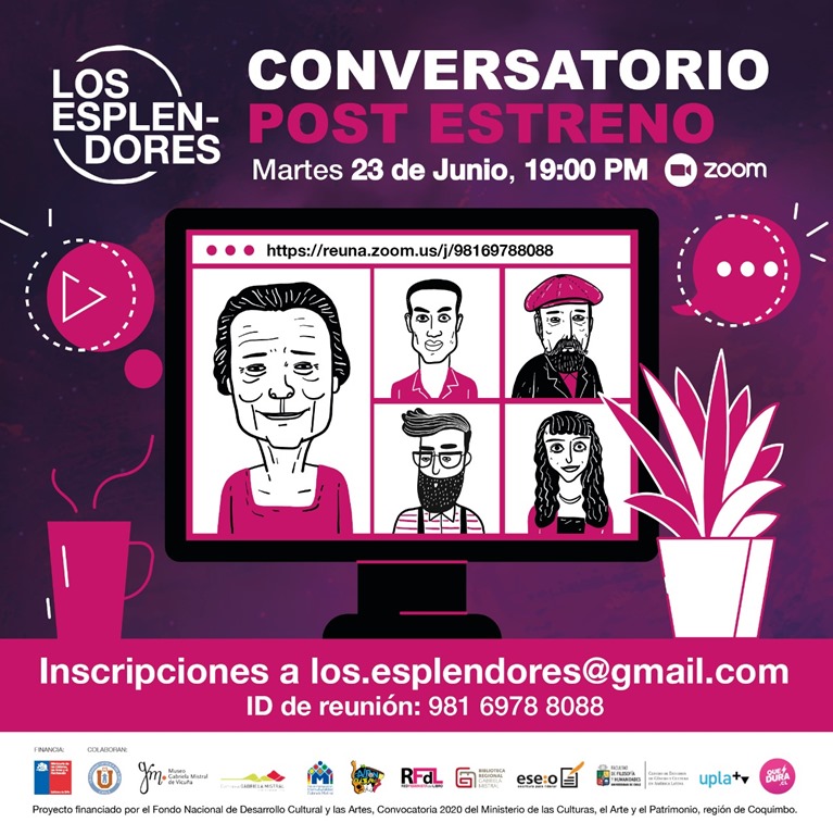 Al igual que en la primera charla, el trabajo de Kamila Muñoz se estrenará a través del canal de YouTube de “Los Esplendores” el día 23 de junio a las 16:00 horas, el que contará con un conversatorio post estreno con la charlista vía plataforma Zoom a las 19:00 horas.