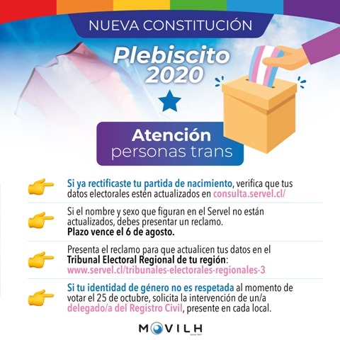 El Movimiento de Integración y Liberación Homosexual (Movilh) lanzó hoy una campaña para que las personas trans que han rectificado su partida de nacimiento luego de la entrada en vigencia de la Ley de Identidad de Género puedan actualizar sus datos electorales, con miras al plebiscito del 25 de octubre próximo.