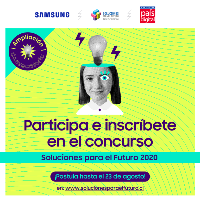 Si eres profesor o estudiante de enseñanza media no pierdas la oportunidad de participar en el Concurso “Soluciones para el Futuro 2020”. ¡Los ganadores se llevarán increíbles premios de tecnología Samsung! El plazo de inscripción de equipos y presentación de la problemática se amplió hasta el domingo 23 de agosto, finalizando así la primera etapa del concurso.
