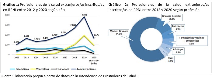 En el primer gráfico se puede ver cómo ha aumentado el total de profesionales extranjeros inscritos en el Registro Nacional de Prestadores Individuales de Salud (RNPI) desde 2012 a junio 2020. De esta forma se ve como desde 2017 se sobrepasa los 2000 por año, para llegar a los 3.831 en 2019.