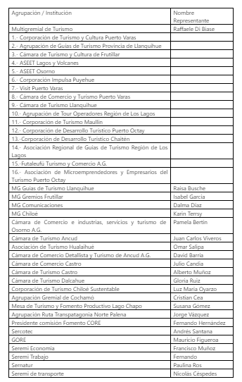 Por su parte, desde la Federación de Gremios de Turismo región de Los Lagos, Raffaele Di Biase indicó “estamos satisfechos del trabajo de la segunda reunión de la mesa, creemos que hemos podido establecer una metodología de trabajo y estamos muy contentos de que se haya podido aprobar la propuesta que la Federación de Gremios de Turismo de la región de Los Lagos trajo a la mesa en relación a una metodología de trabajo que se concentre en la conformación de 2 comisiones, una de reactivación y promoción, bajo un paraguas de una estrategia de financiamiento que debe poder llegar a ambas comisiones y acciones que estas comisiones tomen, ojalá recogiendo la expertiz que hay en esta mesa y poder volcarla para un trabajo macro, territorial, regional, poniéndonos la camiseta de la región, poniéndonos la camiseta de Chile y de la región y así poder avanzar no solo en el hoy que tenemos que claramente atender, pero además no podemos olvidarnos ahora ya de trabajar en el mañana. Solamente si avocamos nuestros esfuerzos a ambas instancias a lo que esté pasando hoy y a lo que va a pasar mañana, vamos a poder salir de esta crisis fortalecidos. Estamos muy contentos nuestros colegas también de la mesa aceptaron con buena actitud nuestra propuesta, las autoridades lo mismo así que estamos con todas las ganas para reconstruir y proyectar nuestro sector y nuestra región donde el turismo es una fuerza potente y que estamos seguros va a volver más fortalecida que antes”.
