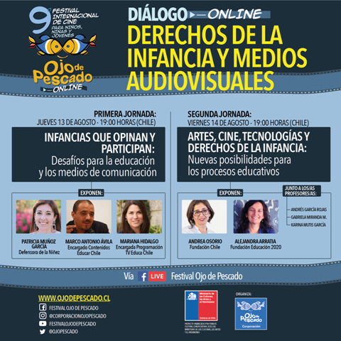 Debido a la amplia y diversa programación de este año, el 9º Festival Internacional de Cine para Niños, Niñas y Jóvenes, Ojo de Pescado, no puede empezar sin antes empaparse de la opinión de especialistas sobre las importantes temáticas que atraviesan a nuestra infancia. El puntapié inicial de las conversaciones será este jueves 13 de agosto con el conversatorio “Derechos de la infancia y medios audiovisuales”, a partir de las 19:00 horas y a través de Facebook Live Festival Ojo de Pescado, el cual contará con una segunda jornada al día siguiente, el viernes 14 de agosto.
