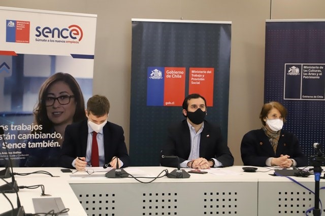 Un total de 3.000 becas gratuitas de cursos de capacitación especialmente diseñadas para quienes trabajan en artes escénicas, música, diseño y audiovisual lanzaron esta mañana la ministra de las Culturas, las Artes y el Patrimonio, Consuelo Valdés, y el Ministerio del Trabajo y Previsión Social, representado por el subsecretario del Trabajo Fernando Arab, en conjunto con el director nacional del Servicio Nacional de Capacitación y Empleo (SENCE), Juan Manuel Santa Cruz.