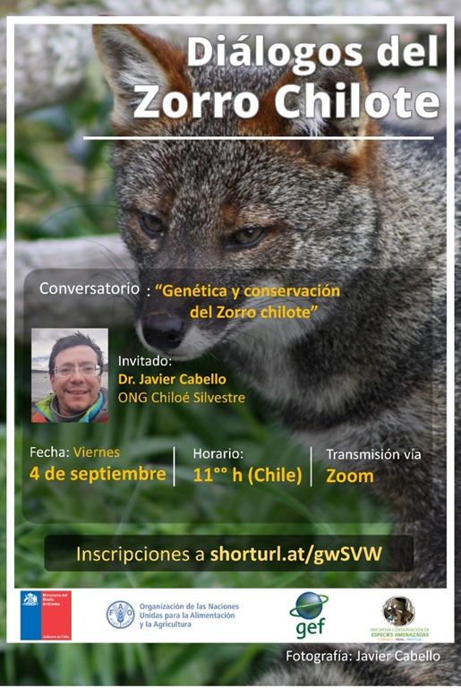Se realizaran diálogos del Zorro Chilote con el conversatorio “Genética y Conservación del Zorro Chilote” el viernes 4 de septiembre a las 11:00 horas, vía zoom. En esta ocasión, el invitado será el doctor Javier Cabello de la ONG Chiloé Silvestre.