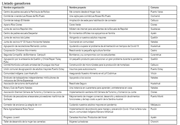Los ganadores corresponden a proyectos de Puerto Varas, Cochamó, Calbuco, Puerto Cisnes, Islas Guaitecas, Puerto Aysén, Quellón, Puerto Natales, Hualaihué, Castro, Curarrehue, Puerto Octay, Vilcún, Puerto Montt, Melipeuco, Pucón, y Chonchi.