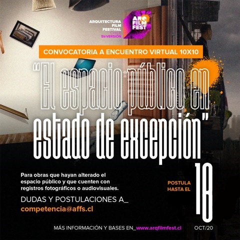 Las bases de esta convocatoria se encuentran en www.arqfilmfest.cl, el correo de contacto es [email protected] y las postulaciones se extienden hasta el domingo 18 de octubre.