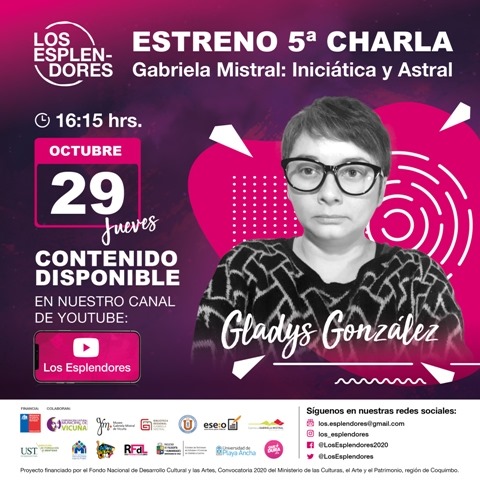 Precisamente este y otros aspectos es que se presentarán en la charla “Gabriela Mistral: Iniciática y astral” que la poeta Gladys González Solís presentará en Los Esplendores, ciclo de siete charlas gratuitas donde se invita a la comunidad a acercarse a la espiritualidad de la Premio Nobel de Literatura de 1945, proyecto financiado por el Fondo Nacional de Desarrollo Cultural y las Artes, Convocatoria 2020 del Ministerio de las Culturas, el Arte y el Patrimonio, y que está a cargo del sociólogo Breno Donoso Betanzo.