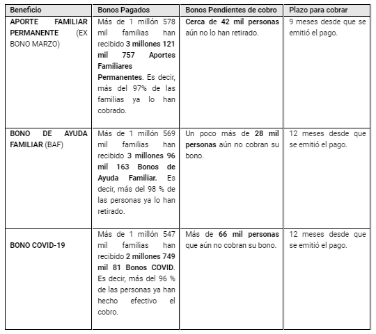 Para facilitar las consultas (que ya se pueden hacer en las páginas www.aportefamiliar.cl; www.bonoayuda.cl y www.bonocovid.cl) se dispuso el sitio www.bonospendientes.cl, donde, “con sólo su RUN y fecha de nacimiento, las personas podrán saber si tienen uno de estos tres bonos pendientes de cobro, y a partir del 6 de noviembre sabrán el lugar de cobro que se les asignará”, explicó el Subsecretario Pedro Pizarro.