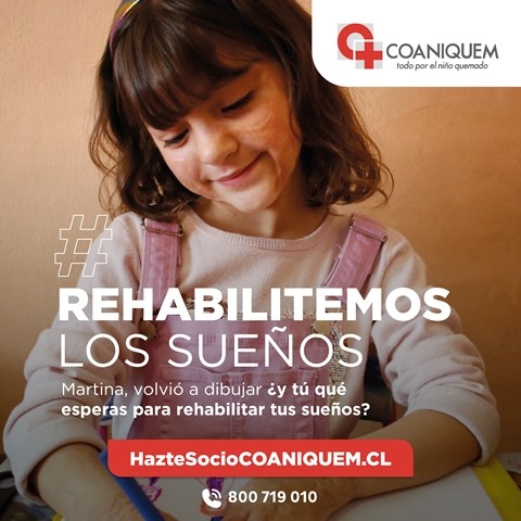 Junto con llamar a todos a cuidar a nuestros niños y evitar sus quemaduras en el hogar, COANIQUEM invita a la comunidad a sumarse como socios cooperadores realizando un aporte mensual. La campaña #RehabilitemosLosSueños se centra en los sueños de los niños que se vieron truncados cuando se quemaron, pero que hoy gracias al apoyo mensual de los socios cooperadores, pueden volver a ser una realidad, gracias a la rehabilitación recibida en COANIQUEM. “Antes de llegar a COANIQUEM la Martina tuvo el peor pronóstico con sus manos y en la primera consulta con el fisiatra de COANIQUEM, el doctor me dio la tranquilidad de que a los 5 años, cuando entrara al colegio, sus manos serían completamente funcionales, podría tomar un lápiz o cortar con una tijera como cualquier otro niño. Para mi sorpresa la Martina mucho antes de los 3 años hacía eso y más.”, señala Katy Halvorsen, mamá de Martina, paciente de COANIQUEM desde 2015.