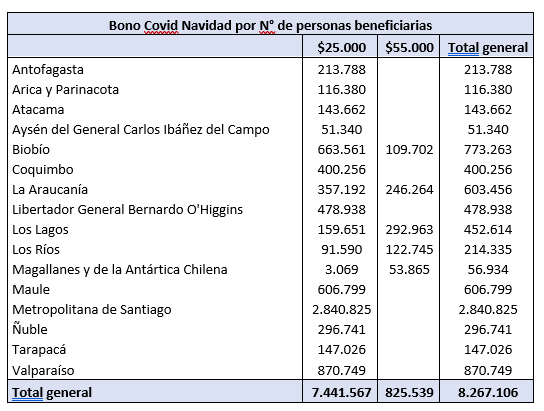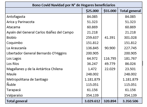 Sobre este apoyo, la subsecretaria Alejandra Candia destacó que “serán 320.894 hogares los que recibirán el Bono Covid Navidad de $55.000, lo que equivale a 825.539 personas beneficiadas, lo que se suma a quienes recibirán el aporte de $25 mil por integrante, con lo que estaremos llegando a más de 3,3 millones de familias. Con esto seguimos dando una mano desde el Estado a aquellas familias que han pasado meses difíciles, en especial a aquellos hogares en donde vieron afectados fuertemente sus ingresos y que aún ven comprometidas sus posibilidades de generar ingresos debido a las medidas de confinamiento”.