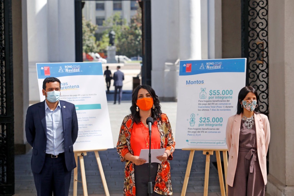 Esta mañana, el Presidente Sebastián Piñera en conjunto con la Ministra de Desarrollo Social y Familia, Karla Rubilar, y los subsecretarios de Evaluación Social, Alejandra Candia, y de Servicios Sociales, Sebastián Villarreal, anunciaron el inicio de los pagos del Bono Covid Navidad.