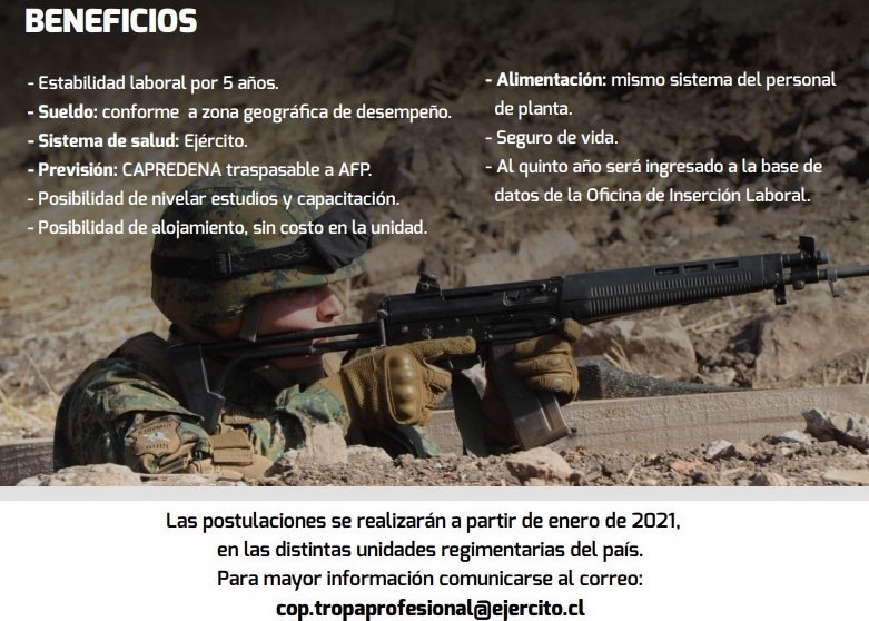 Anualmente el Ejército invita a jóvenes que se encuentran realizando el Servicio Militar y con situación militar al día, a postular a la planta del Ejército como Soldado de Tropa Profesional.