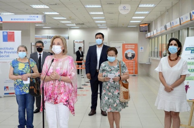 Acompañadas por el subsecretario de Previsión Social (s) Francisco Oxa, y el director del Instituto de Previsión Social (IPS), Patricio Coronado, la primera dama y la ministra del Trabajo llegaron hasta una sucursal de la Caja de Compensación Los Héroes en el centro de Santiago para dar a conocer la medida, que en los primeros 4 días de pagos ya ha sido recibida por más de 165 mil personas, equivalente al 12% del total de aquellos que reciben Pensión Básica Solidaria (PBS) y Pensión Máxima con Aporte Solidario (PMAS).