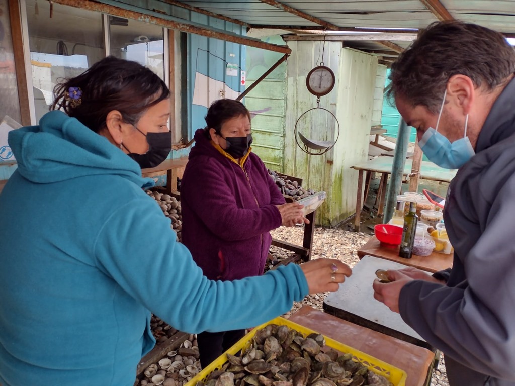 En el muelle Pudeto, comuna de Ancud, el secretario regional ministerial (seremi) de Economía en la región de Los Lagos, Francisco Muñoz junto a la directora regional de Sernatur, conocieron a tres de las 114 mujeres de la pesca artesanal y recolectoras de orilla preseleccionadas del concurso Capital Semilla Emprendedora Artesanal del Indespa.