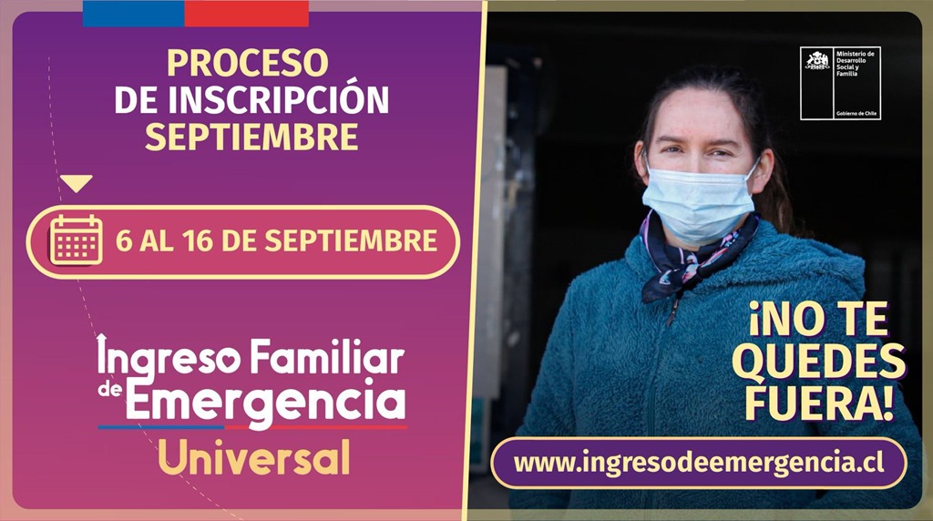 La ministra Rubilar explicó que “entre el 6 y el 16 de septiembre esperamos llegar a esos hogares que todavía no reciben el Ingreso Familiar de Emergencia Universal y que están en el Registro Social de Hogares y lo requieren. Es muy importante recalcar que para este proceso deben inscribirse solo aquellos que no han recibido el beneficio anteriormente. Todos aquellos que lo han recibido no necesitan hacer ningún trámite, están completamente inscritos y su pago va a ser de forma automática”.