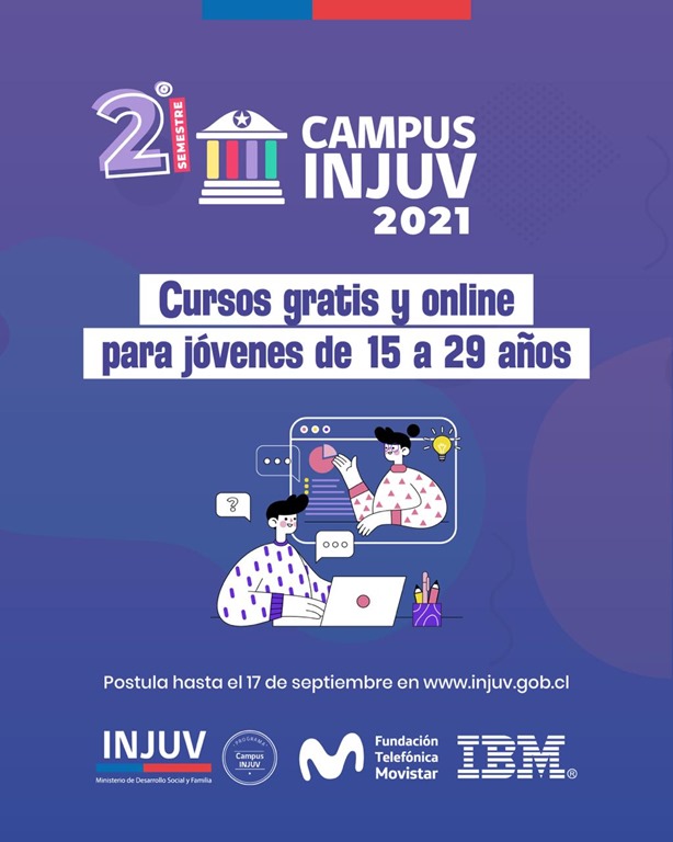 Los jóvenes que estén interesados tiene hasta el 17 de septiembre, toda la información esté en la página web de INJUV: https://www.injuv.gob.cl/personas/noticias/injuv-lanza-14-cursos-gratuitos-de-formacion-junto-telefonica-e-ibm.