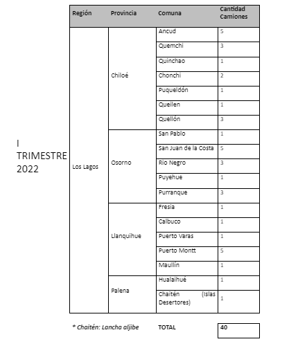 De esta forma, se destinarán 39 camiones aljibes y una lancha aljibe para la Isla Desertores en la comuna de Chaitén con una inversión que alcanzará cerca de 450 millones de pesos para los 3 primeros meses del año.