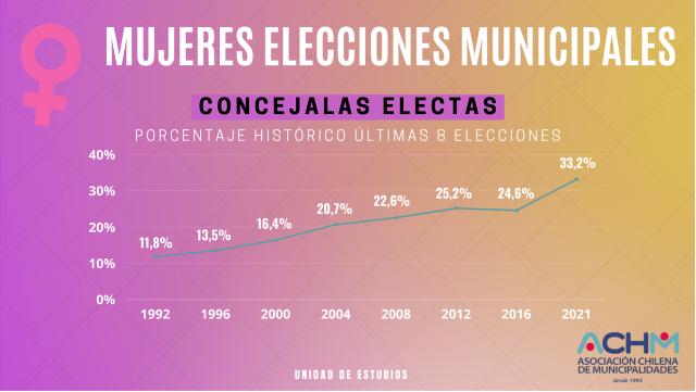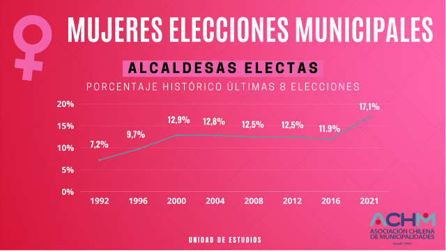 Actualmente para el periodo 2021-2024, hay solo 60 mujeres en el país, ejerciendo el cargo de alcaldesa y 285 hombres como jefes comunales, esto equivale solo a un 17% de alcaldesas en las distintas comunas del país. En el caso de las concejalas, solo un 33 % son mujeres y un 66% son hombres, lo que está muy lejos de ser una representación paritaria de la mujer, en el nivel político local.