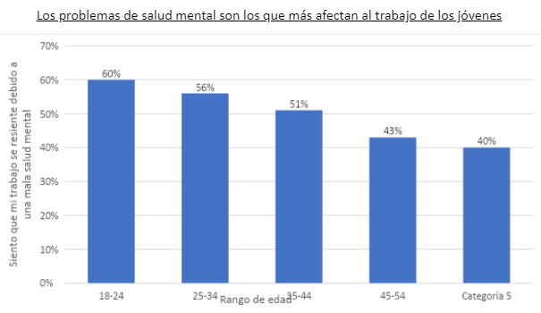 Según la encuesta realizada a casi 33.000 trabajadores de 17 países, se reveló que esta cifra varía dependiendo del rango etario y se eleva al 60% entre los jóvenes de 18 a 24 años, luego un 56% entre los de 25 a 34 años, seguido por 40% de los mayores de 55 años.