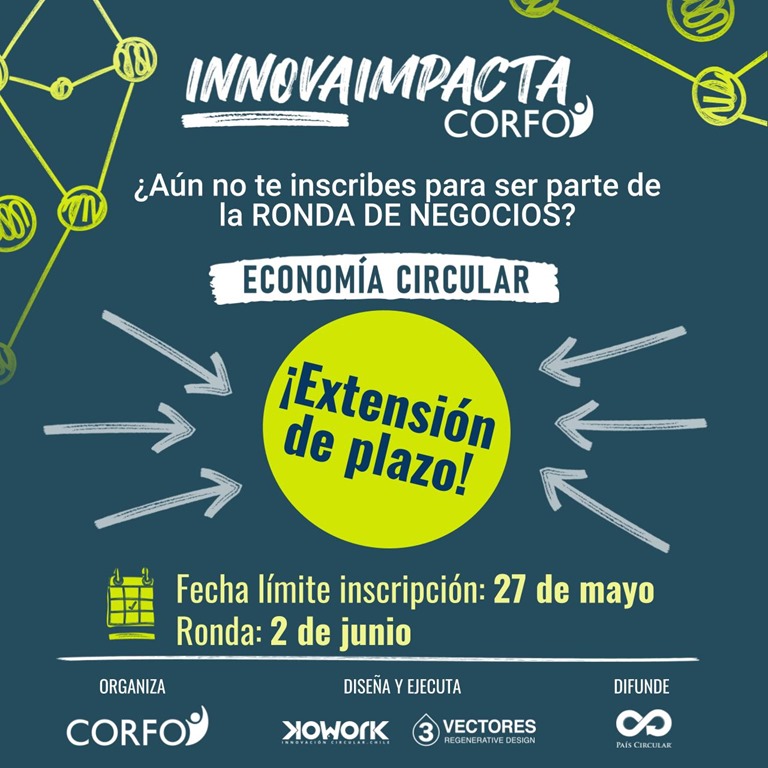 Corfo anunció que el próximo viernes 27 de mayo es la nueva fecha límite de inscripción para la Ronda de Negocios “InnovaImpacta” con foco en Economía Circular, actividad que realizará a nivel nacional el jueves 2 de junio, de forma 100% online y gratuita para sus participantes.