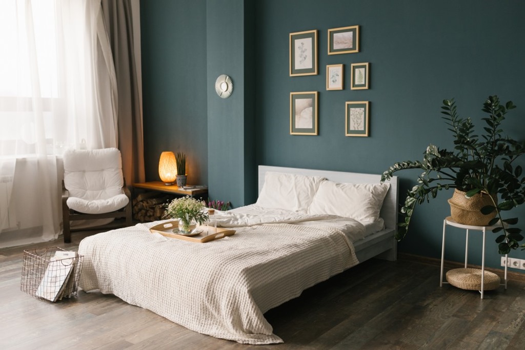 La combinación de colores de tu dormitorio puede ser un punto focal y generar un interesante contraste con el resto. Los mejores colores para esto son los verdes y azules. Si desea agregar algunos elementos florales, intenta usar sábanas con estampados botánicos u hojas tropicales.