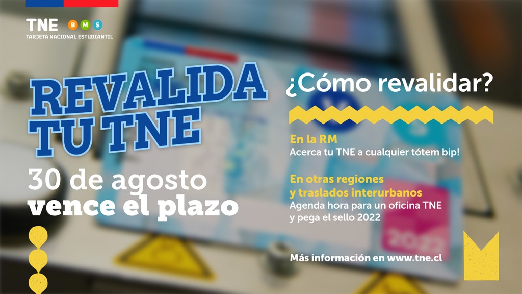 El martes 30 de agosto expira el plazo para revalidar la Tarjeta Nacional Estudiantil (TNE), beneficio que permite acceder durante todo el año a tarifas reducidas en los medios de transporte asociados a Red de Movilidad en el caso de la capital, y a los buses de transporte urbano en regiones.
