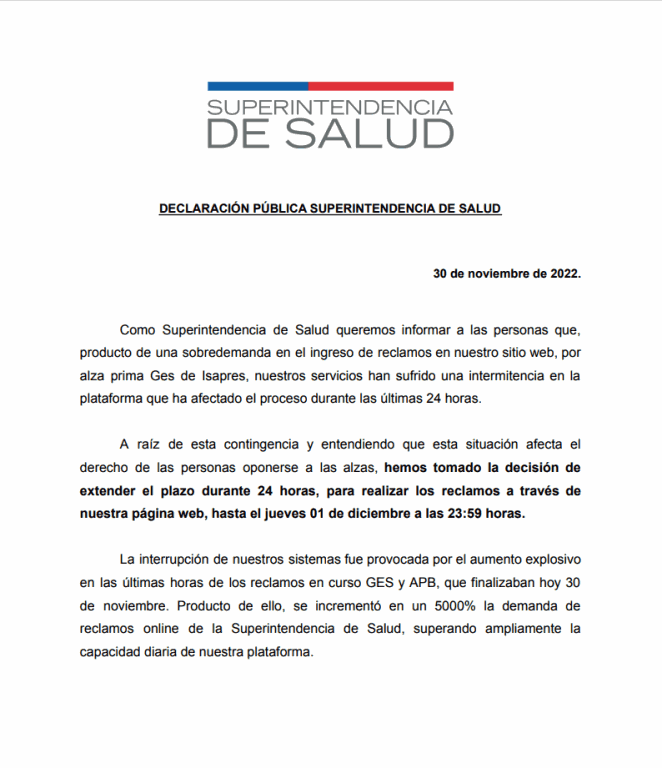 A través de un declaración pública la Superintendencia de Salud informa que producto debido a una sobredemanda en el ingreso de reclamos del sitio web de la institución, por el alza prima Ges de Isapres, el servicio ha sufrido un intermitencia en la plataforma que ha afectado el proceso durante las últimas 24 horas.