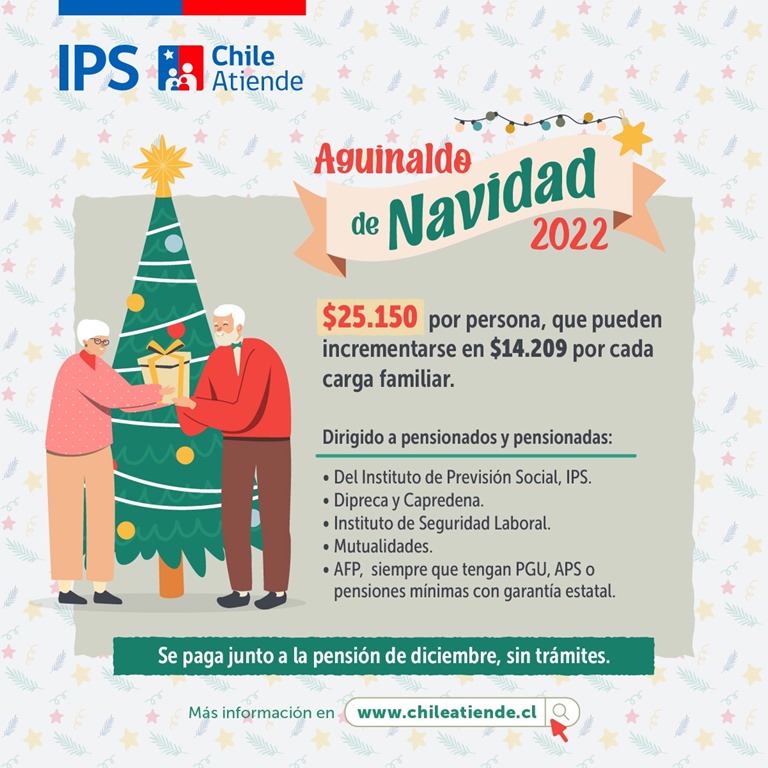 “En la Región de Los Lagos, estimamos que más de 67 mil pensionadas y pensionados serán beneficiados con el Aguinaldo de Navidad, beneficio que comenzamos a entregar este 1 de diciembre. El Estado invertirá un monto superior a los mil setecientos millones de pesos para llegar con esta ayuda económica a los pensionados y sus cargas familiares de nuestra región”, indicó Dalmiro Yañez, director IPS Chileatiende de la región de Los Lagos.