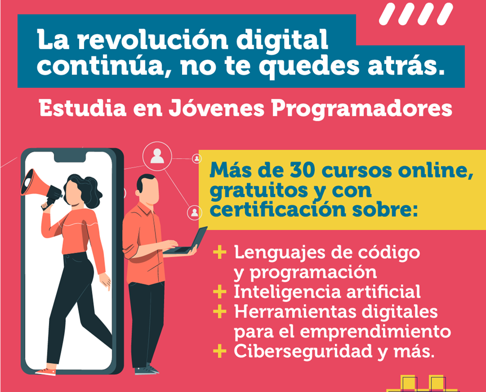 Jóvenes Programadores abre una nueva convocatoria para más de 30 cursos en línea gratuitos que permiten aprender sobre lenguajes de código y programación, ciberseguridad, inteligencia artificial y emprendimiento, entre otras materias.