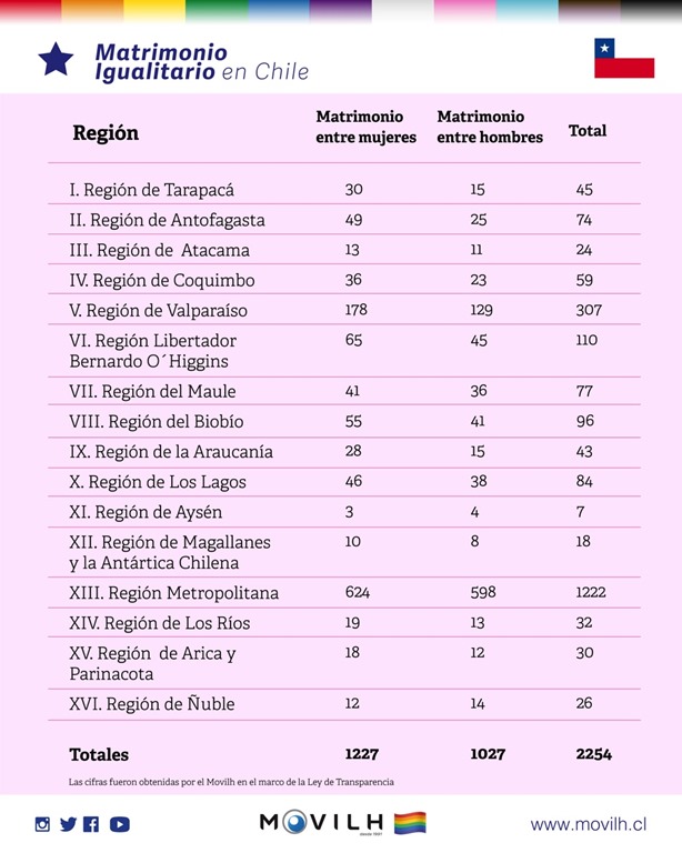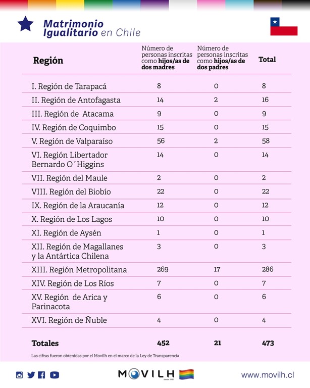 Las cifras, obtenidas por el Movilh en el marco de la Ley de Transparencia; arrojan que del total de matrimonio igualitarios, 1.127 fueron entre mujeres y 1.027 entre hombres. En tanto, 452 personas fueron inscritas como hijos/as de dos madres y 21 como hijos/as de dos padres.