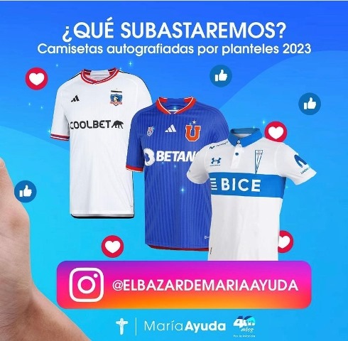 Finalizando su mes de colecta, María Ayuda subastará una camiseta del Club Social y Deportivo Colo-Colo; una del Club Universidad de Chile; y otra del Club Deportivo Universidad Católica; todas firmadas por sus jugadores, en un Live de Instagram, animado por Matías Vega, que se realizará mañana miércoles 31 de mayo a las 19.30 horas.
