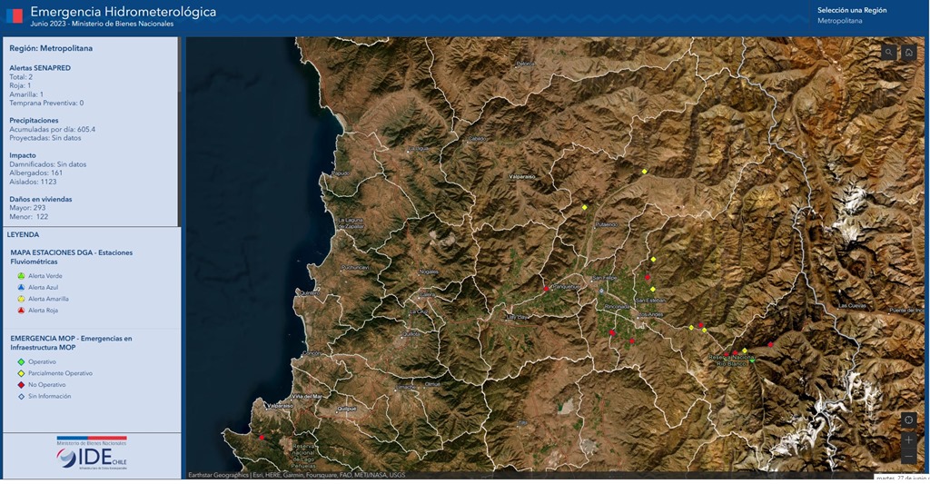 La herramienta desarrollada por la IDE Chile contiene información georreferenciada de albergues, precipitaciones y situación de daños.Ante la emergencia ocasionada por el sistema frontal que afecta a la zona centro sur del país, el Ministerio de Bienes Nacionales, a través de la Infraestructura de Datos Geoespaciales de Chile, IDE Chile, publicó un visor territorial con información georreferenciada de algunos efectos de las lluvias y desborde de ríos.