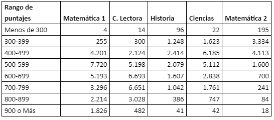A continuación, se muestra la cantidad de personas que se encuentran en un cierto rango de puntajes, en cada prueba: