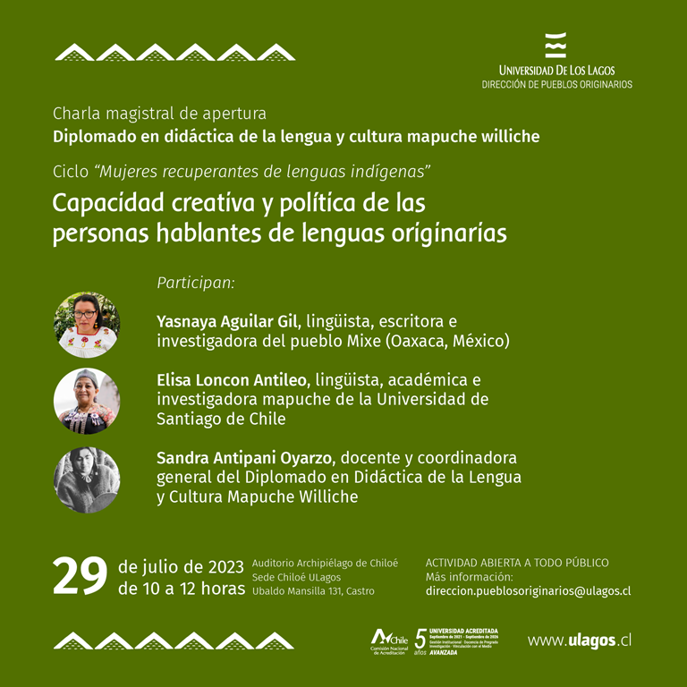 La desaparición de las lenguas indígenas se ha profundizado de forma acelerada en los últimos años a nivel mundial, actualmente existen unas 6 mil lenguas indígenas, según estimaciones de la Organización de las Naciones Unidas para la Educación, la Ciencia y la Cultura (UNESCO). ‘‘En 100 años se habrá perdido la mitad’’, alerta Yásnaya Elena A. Gil, lingüista del Pueblo Mixe que visitará Chiloé en el marco de la charla magistral titulada “Mujeres recuperantes de lenguas indígenas: Capacidad creativa y política de las personas hablantes de lenguas originarias”, a realizarse el próximo 29 de julio en el auditorio de la sede Chiloé de la Universidad de Los Lagos como parte del acto inaugural del Diplomado en Didáctica de la Lengua y la Cultura Mapuche Williche
