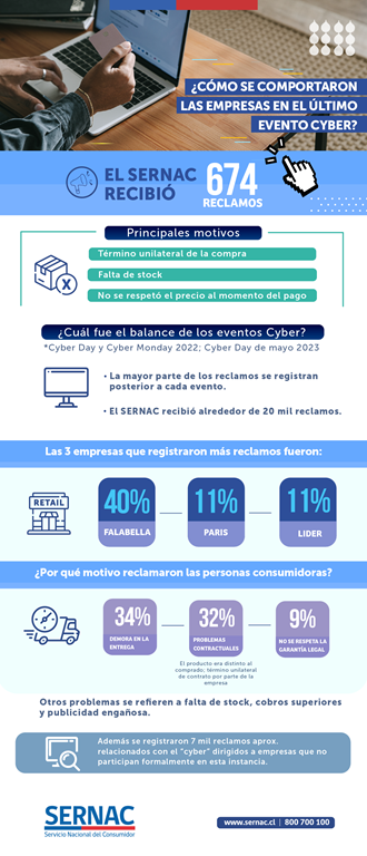 No obstante, la mayor parte de los reclamos se registran posterior al evento porque dicen relación con la falta de stock, retraso en la entrega o término unilateral del contrato. Por ejemplo, si tomamos en cuenta los tres eventos cyber pasados (Cyber Day y Cyber Monday del año 2022 y el Cyber Day de mayo de 2023), el SERNAC recibió alrededor de 20 mil reclamos en contra de las empresas participantes.