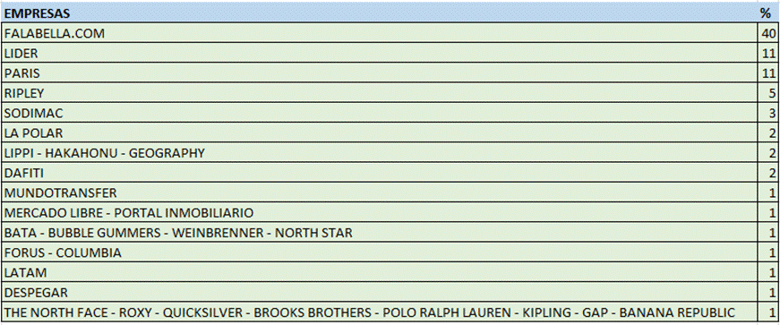 Al revisar la cantidad de reclamos por empresas, sin considerar la participación de mercado y el número de transacciones, Falabella[1] lideró con un 40% del total de los reclamos; le siguió Lider (11%) y Paris (11%).