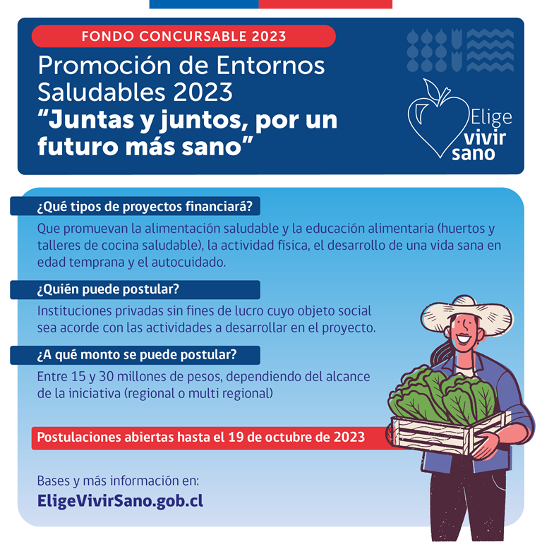 El Fondo Concursable “Promoción de Entornos Saludables 2023 – Juntas y juntos por un futuro más sano”, dispuso de un total de $818 millones para el financiamiento de un máximo de 50 proyectos de instituciones privadas sin fines de lucro que promuevan los hábitos y entornos saludables provenientes de las 16 regiones del país, con montos que pueden ir de los 15 a los 30 millones de pesos, según su nivel de alcance (regional o multi regional).