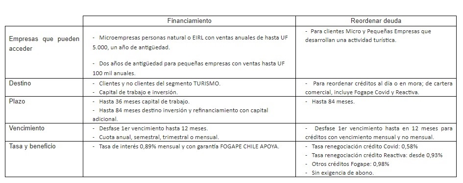 Se trata de opciones de financiamiento y de reordenamiento de deudas dirigidos a microempresas, clientes y no clientes del segmento Turismo, con plazos de hasta 84 meses, desface en los vencimientos de hasta 12 meses y tasas preferentes.