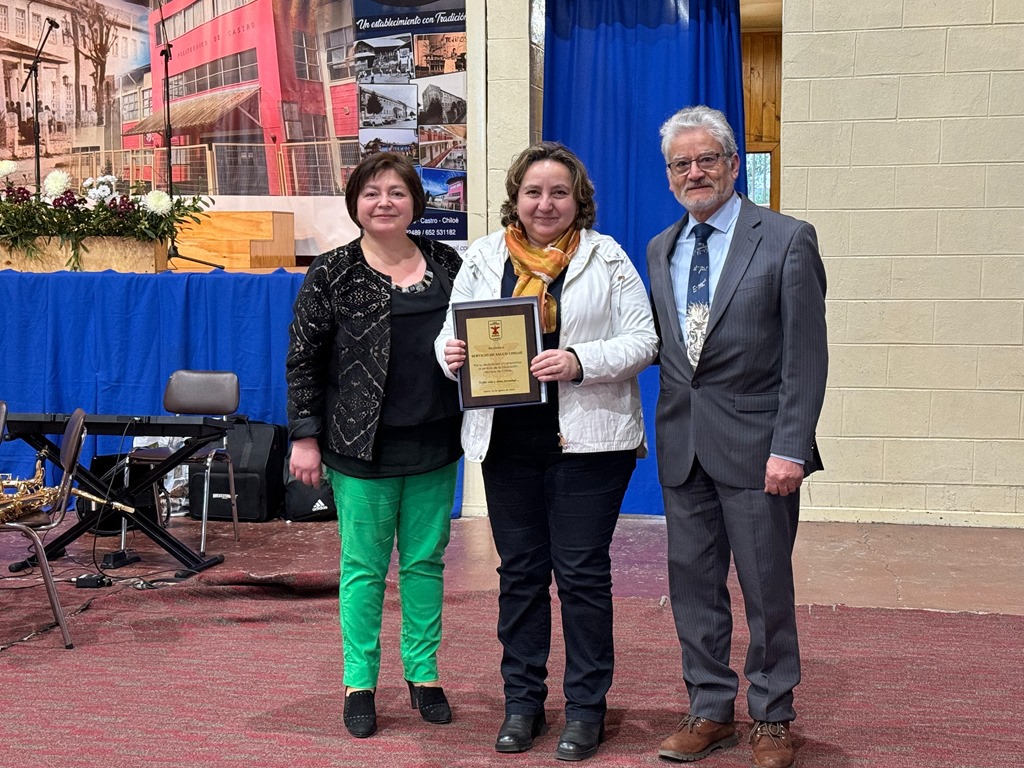 El reconocimiento fue entregado de manos de los jefes técnicos del área de Administración y Servicio Industrial, los docentes, Doris Arteaga y Pedro Villarroel, a la directora del Servicio de Salud Chiloé, Marcela Cárcamo, por la colaboración desde el punto de vista académico y el apoyo constante de charlas informativas de profesionales de la institución a los alumnos del recinto y por su contribución como fuente laboral.