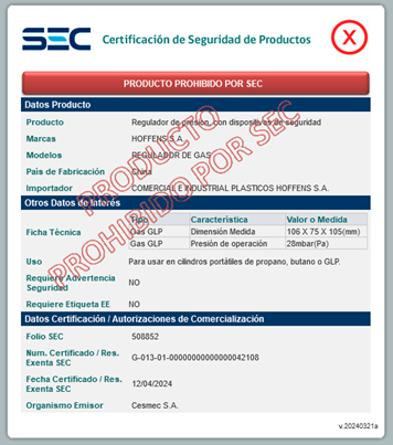 Luego de una acción de coordinación con la Superintendencia de Electricidad y Combustible (SEC), en el marco de la Mesa Nacional de Seguridad, en la que el Servicio Nacional del Consumidor (SERNAC) la preside, la empresa Comercial e Industrial Plásticos Hoffens informó una alerta de seguridad para su producto “Regulador de Gas” o “Regulador de Presión” con dispositivo de seguridad. El regulador, destinado a utilizarse en cilindros de gas de 5, 11 y 15 kilogramos (GLP), presenta un defecto de fabricación que representa un riesgo para los consumidores.