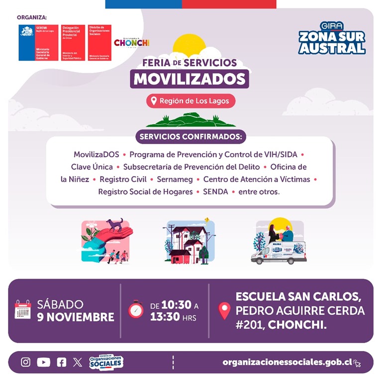 El sábado 09 de noviembre, entre las 10:30 y las 13:30 horas, se realizará la Feria de Servicios “Movilizados” en la Escuela San Carlos de Chonchi (Pedro Aguirre Cerda #201).