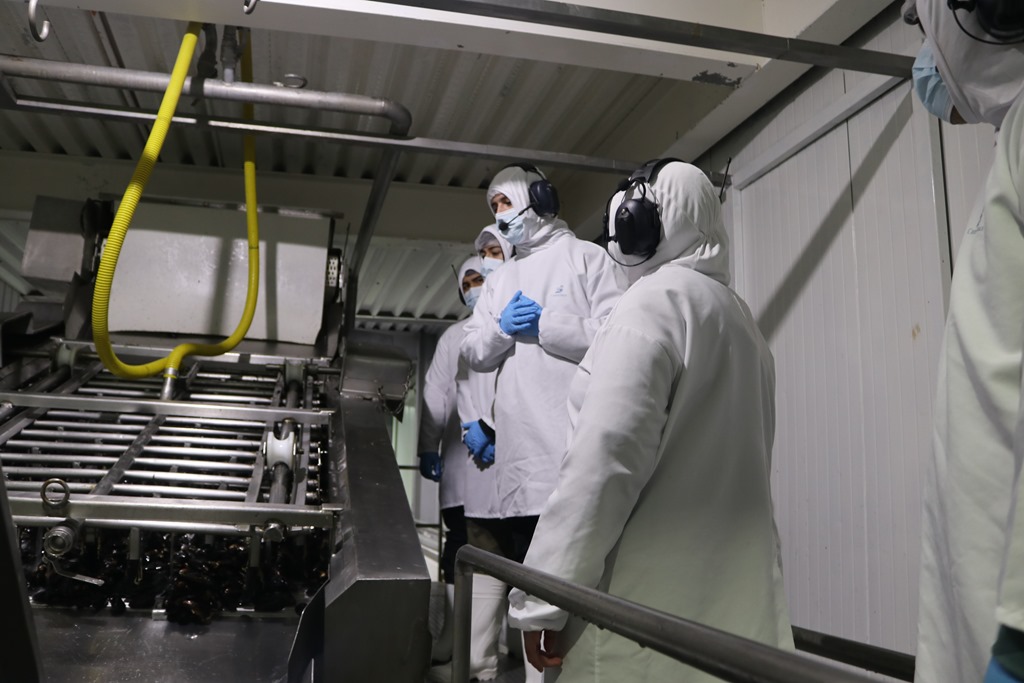 Durante el recorrido, las y los estudiantes observaron en detalle las distintas etapas del procesamiento de choritos, desde su llegada a planta hasta su preparación para exportación. También se abordaron temas relacionados con eficiencia energética y sustentabilidad, destacando el uso de cal oil, un combustible reciclado utilizado en la cocción de productos del mar, lo que refleja el compromiso de la empresa con prácticas más limpias.