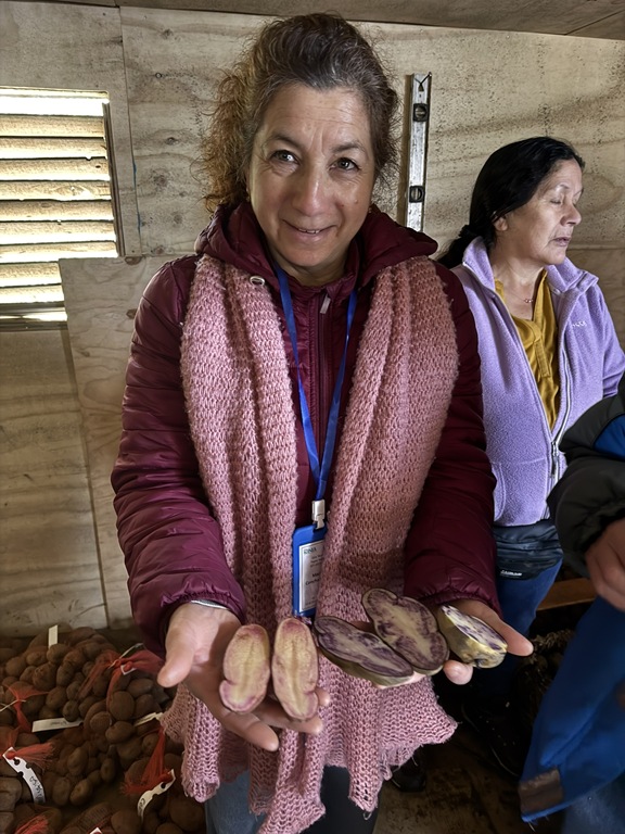 La actividad liderada por la investigadora Dra. Mayeli Moreno de INIA, incluyó agricultores de Carahue, Saavedra, Teodoro Schmidt, Toltén, Freire y Gorbea; técnicos PDTI y PRODESAL; como también profesionales de INDAP e INIA, lo que permitió fomentar el intercambio de conocimientos en agroecología, cosecha, almacenaje, procesamiento, asociatividad y comercialización de papas nativas para consumo fresco y productos procesados. “El objetivo general de esta iniciativa fue fortalecer las capacidades productivas y comerciales de los agricultores y equipos técnicos participantes, diversificando sus sistemas y mejorando su competitividad en mercados diferenciados. Como resultado de la gira publicaremos un informativo con los aprendizajes y el potencial productivo identificado, además de realizar un seminario para compartir experiencias con otros agricultores y profesionales, a fin de evaluar la factibilidad de implementar las tecnologías en los predios de La Araucanía”, señaló la Dra. Moreno.