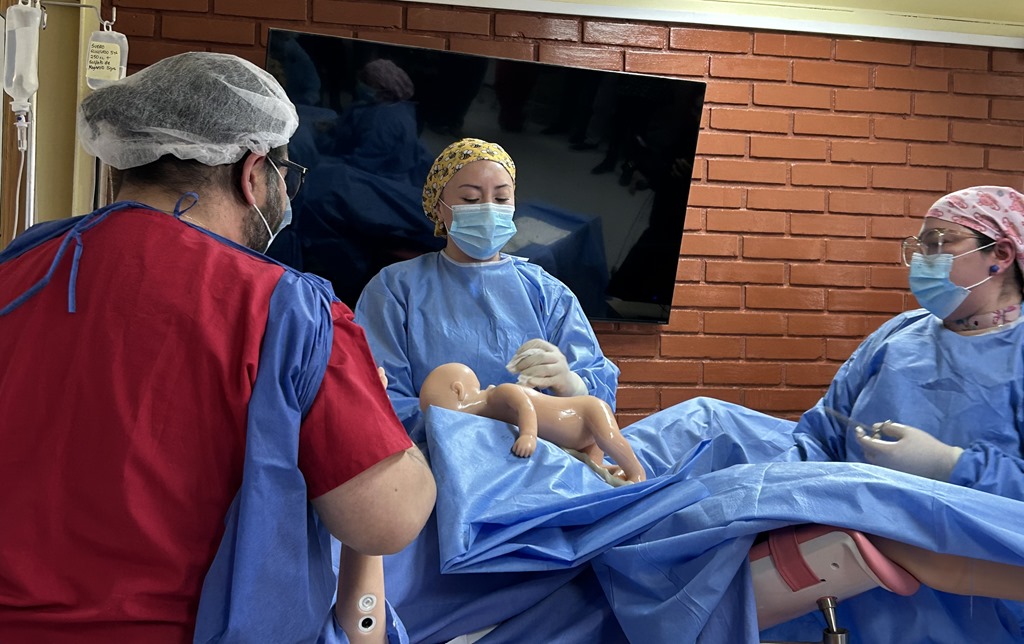 La entrega oficial del equipamiento contó con una breve demostración de algunas maniobras para enfrentar diferentes situaciones clínicas que se pueden presentar durante un parto.
